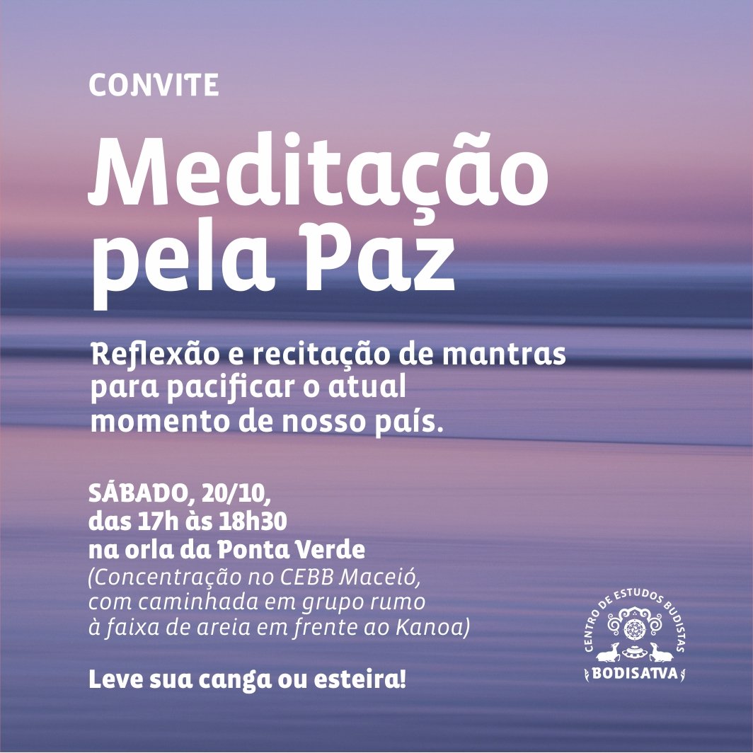 Pacificar este momento de estremecimento, medo e episódios de violência pelo qual passa o Brasil, por meio do fortalecimento de redes compassivas e amorosas: esse é o convite que o Centro de Estudos Budistas (CEBB Maceió) faz aos alagoanos neste sábado (20/10), com a realização do encontro “Meditação pela Paz”, na orla da Ponta Verde, das 17h às 18h30.