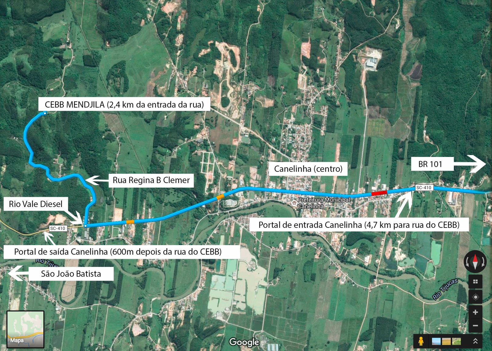 Quem vem no ônibus para Canelinha pode descer no centro da cidade (Canelinha) e de lá pegar um taxi, ou continuar no ônibus e parar um pouco depois de ele sair da cidade, na RUA REGINA B. CLEMER, que fica na esquina da Rio Vale Diesel (desse ponto no asfalto já se vê o portal de saída da cidade 600 metros adiante). Seguir aproximadamente 2,4 km pela rua RUA REGINA B. CLEMER até o portão do CEBB Mendilá, que fica no lado esquerdo.