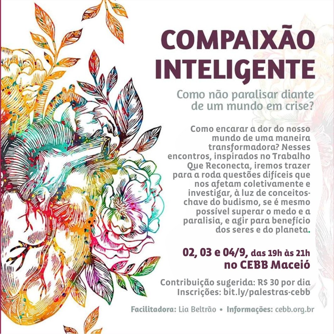 Inspiradas no trabalho desenvolvido pela eco-filósofa e estudiosa do budismo Joanna Macy e pelos ensinamentos do Lama Padma Samten sobre construção de terra pura a partir das cinco sabedorias, a palestra e a oficina têm como intenção abrir uma espaço para contemplarmos juntos os grandes temas que nos afligem coletivamente e investigar se a meditação e conceitos budistas de compaixão, sabedoria e ação lúcida no mundo podem de fato nos ajudar e como.