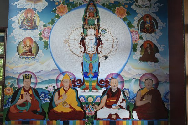 No centro do painel vemos o Buda da Compaixão com mil braços e onze cabeças, Avalokiteshvara. Em cada palma das mãos há olhos, para olhar por todos os seres em todas as dimensões.