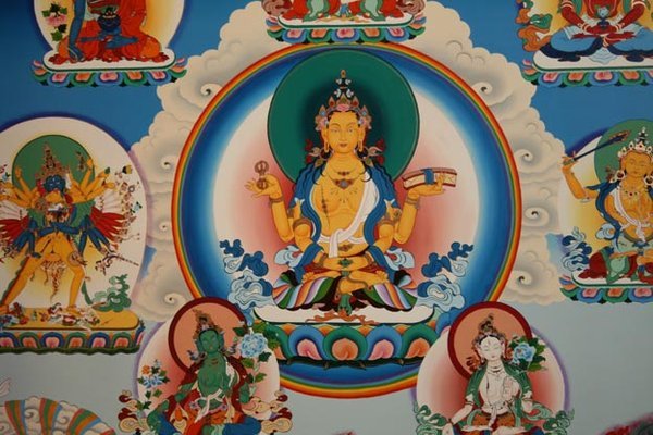 Esse painel é uma composição de varias deidades importantes. Acima centro: Vajradhara: buda azul com braços cruzados segurando 2 vajras, é o Buda primordial, corpo de dharmakaya. Olhando de frente, acima da esquerda a direita, bodhistavas: Buda da Medicina. Chenrezig de quatro braços, o buda da compaixão. Amitayus, buda da longevidade. No meio à esquerda: Kalachakra com consorte, que representa o ciclo dos tempos e das 3 dimensões: externa, interna e alternativa (secreta). No meio à direita: Manjushri, o buda da sabedoria e dos estudos que com sua espada de fogo corta a raiz da ignorância e oferece o sutra de Prajnaparamita que carrega sobre o lótus que segura. No centrto Prajnaparamita, buda da sabedoria que carrega a essência dos ensinamentos de Buda. Aos pés de Prajnaparamita a Tara Verde, a salvadora e Tara Branca, que representa a longevidade para uma vida longa de praticas frutíferas. Abaixo da esquerda à direita o lendário herói tibetano Guesar, Mahakala e Dorje Lekpa, protetores do dharma.