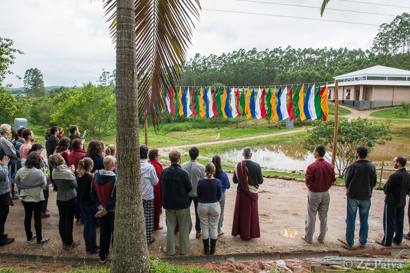 Na manhã do domingo ocorreu o marco formal da inauguração do templo: o hasteamento das bandeiras de oração, com acúmulo de preces e mantras. No budismo tibetano, as bandeiras das cinco cores representam os cinco Diani Budas, ou cinco aspectos da sabedoria compassiva, e as preces de sabedoria impressas nas bandeiras são vistas como tendo o poder de se espalhar pelo vento, junto com a própria sabedoria e as bençãos correspondentes.