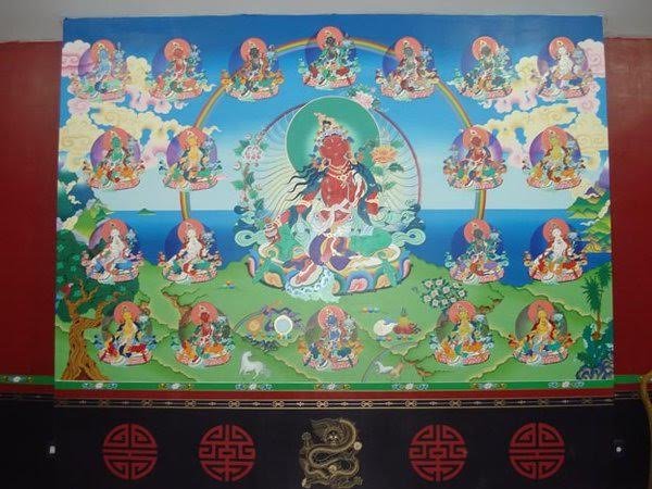 Esse painel é uma composição de varias deidades importantes. Acima centro: Vajradhara: buda azul com braços cruzados segurando 2 vajras, é o Buda primordial, corpo de dharmakaya. Olhando de frente, acima da esquerda a direita, bodhistavas: Buda da Medicina. Chenrezig de quatro braços, o buda da compaixão. Amitayus, buda da longevidade. No meio à esquerda: Kalachakra com consorte, que representa o ciclo dos tempos e das 3 dimensões: externa, interna e alternativa (secreta). No meio à direita: Manjushri, o buda da sabedoria e dos estudos que com sua espada de fogo corta a raiz da ignorância e oferece o sutra de Prajnaparamita que carrega sobre o lótus que segura. No centrto Prajnaparamita, buda da sabedoria que carrega a essência dos ensinamentos de Buda. Aos pés de Prajnaparamita a Tara Verde, a salvadora e Tara Branca, que representa a longevidade para uma vida longa de praticas frutíferas. Abaixo da esquerda à direita o lendário herói tibetano Guesar, Mahakala e Dorje Lekpa, protetores do dharma.