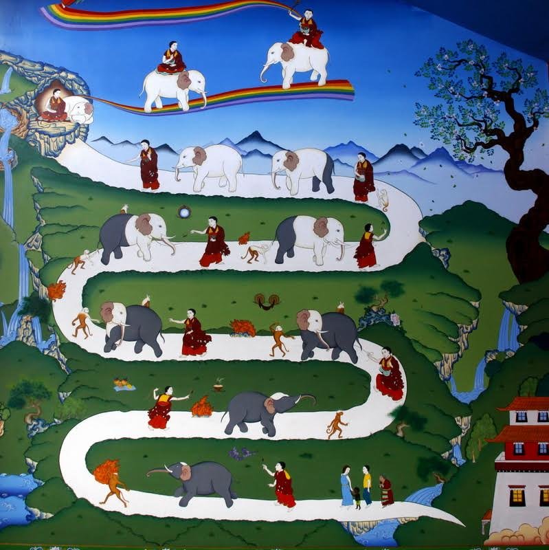 Imagem didática dos passos do caminho do meditante em shamata. Elementos da imagem: O monge que segura um lasso é o individuo. A chama representa esforço. O elefante representa a mente e quando preto é a letargia que aos poucos vai se purificando. O macaco é a distração da mente (que pula de galho em galho). O coelho que assim como o macaco é abandonado no meio do caminho mais avante, é o torpor da meditação. O arco-íris é a compreensão de shunyata, o vazio e o voo é a liberdade completa da mente, despida de qualquer ilusão.