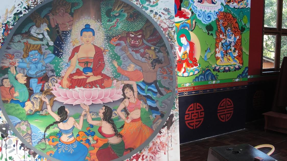O templo do Caminho do Meio, teve suas pinturas iniciadas no fim do ano de 2007, quando o Lama Padma Samten fez o chamado para a artista Tiffani Gyatso para pintar, coordenar e treinar voluntários. Clique no botão abaixo para visualizar um panorama de 360º das pinturas e do templo:
